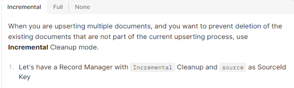 In some cases, you might want to delete existing documents that are derived from the same sources as the new documents being indexed. For that, there are 3 cleanup modes for Record Manager: