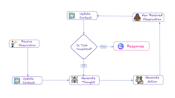 ReAct integrates reasoning with action generation, guiding the model through a sequence of observations, thoughts, and actions. Each step refines the model’s situational awareness, allowing it to adapt to real-time changes. By generating a “thought” that informs each action, ReAct enhances decision-making accuracy, ensuring that outputs align with logical, task-oriented goals.